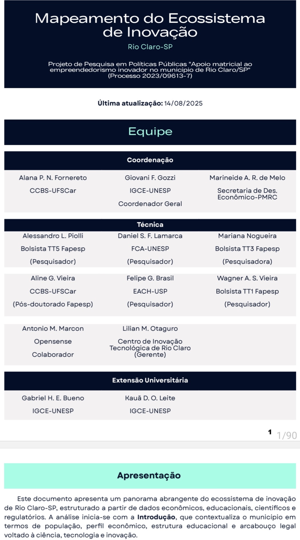 FAPESP - Apoio matricial ao empreendedorismo inovador no município de Rio Claro/SP: Modelagem e implantação de política pública piloto e estruturação do dispositivo apoio matricial para outras redes Pesquisador responsável: Giovani Fornereto Gozzi Instituição-sede: UNESP Geociências